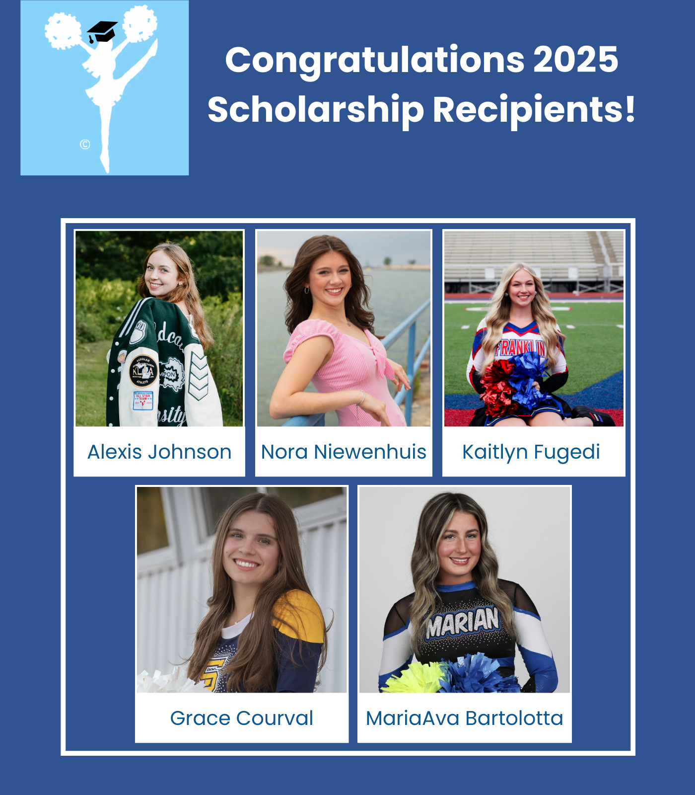 Each January, Mid American Pompon awards a $500 collegiate scholarship to a select number of exemplary high school seniors that are active members of varsity-level pompon teams. Over the last 40 years, Mid American Pompon is proud to have awarded over $82,000 in scholarship funds to college-bound pommers. Scholarship recipients are honored each year, at the start of the Mid American Pompon State Championships which takes place in February.